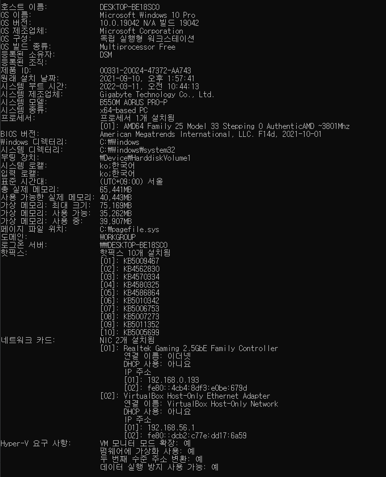 사용할 수 있었다. cmd를 열어 systeminfo를 입력하면 아래와 같은 값을 확인할 수 있다.