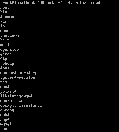 여기서는 '-d:'를 입력해 ':'를 기준으로 자르고 '-f1'을 이용해 첫번째 필드를 출력하도록 했다.